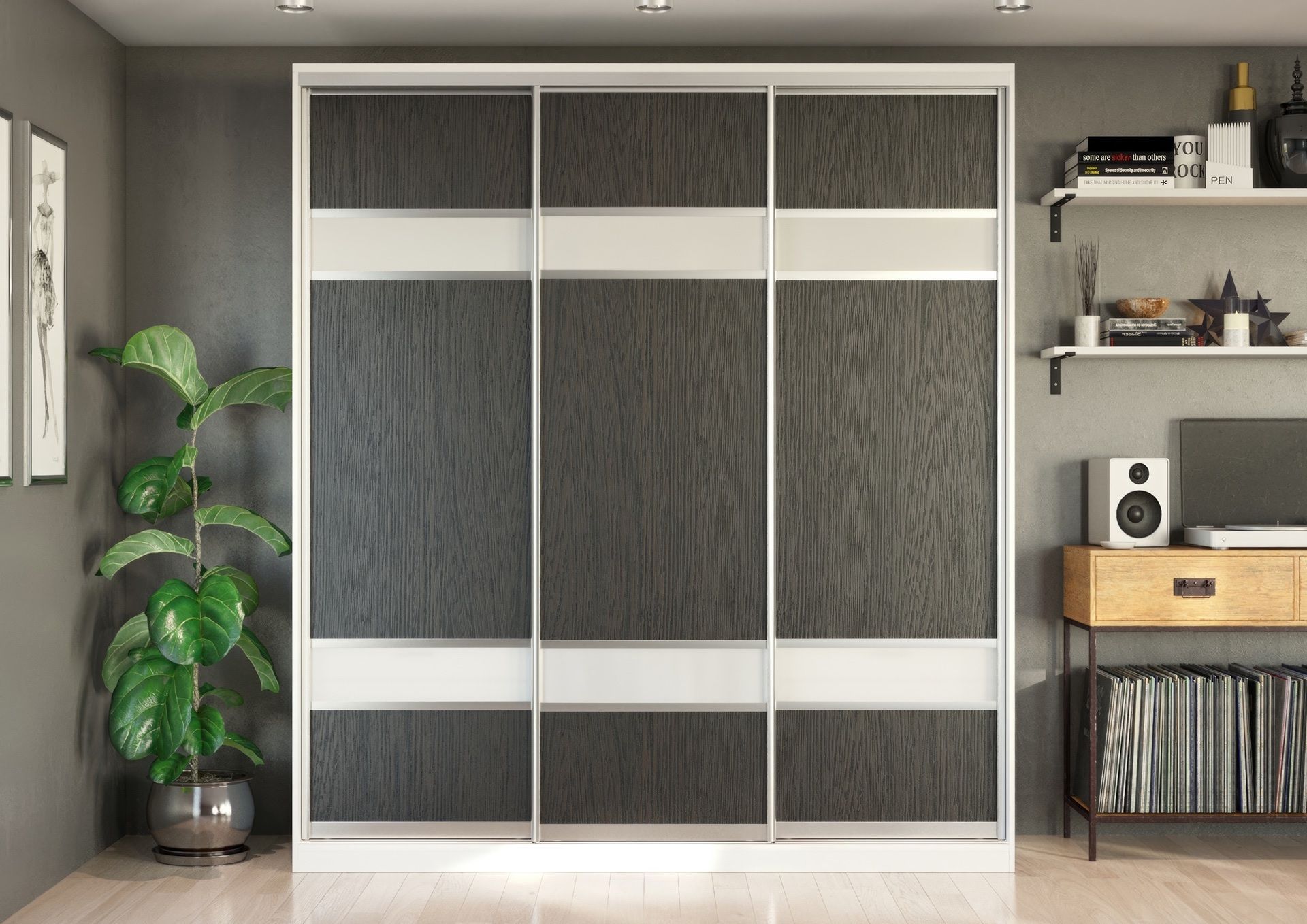 Корпусный шкаф-купе 3-х дверный в гостиной – элегантное и лаконичное решение для системы хранения. Двери-купе для шкафа выполнены в профиле С цвета «серебро матовое», наполнение дверей – Венге соренто от Lamarty, вставки – стекло Lacobel 9003 white pure.