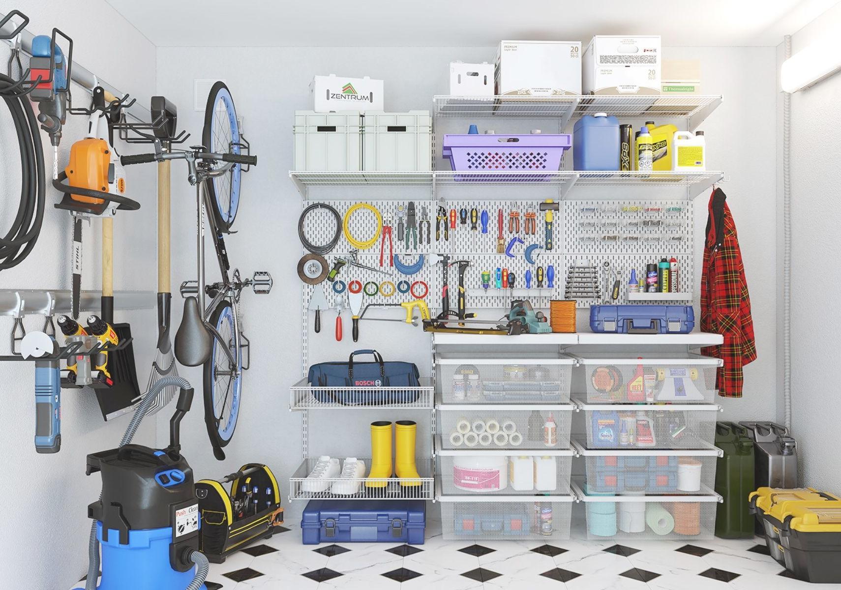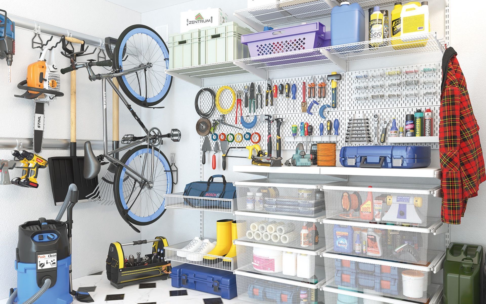 Элементы системы хранения ARISTO для гаража и мастерской выполнены из стали: полки проволочные, сетчатые выдвижные корзины гардеробной системы.